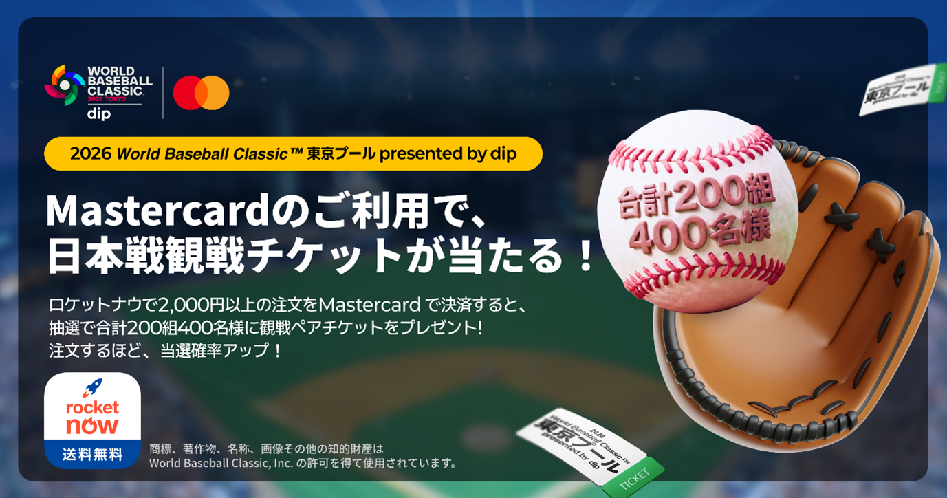 Mastercardは、送料・サービス料無料のフードデリバリーサービス「Rocket Now(ロケットナウ)」と連携し、日本で開催される「2026 World Baseball Classic™ 東京プール presented by dip」を記念したキャンペーンを実施します。