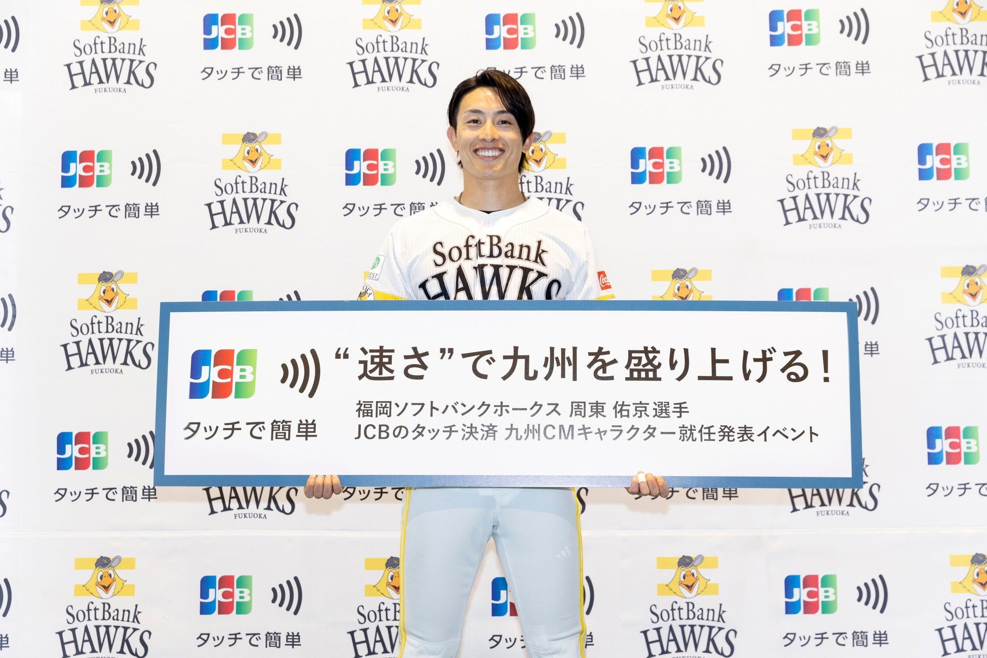 株式会社ジェーシービー (本社:東京都港区、代表取締役会長 兼 執行役員社長:二重 孝好、以下:JCB)は、福岡ソフトバンクホークス 周東佑京選手を九州エリアにおけるJCBのタッチ決済CMキャラクターに起用し、2026年3月上旬より九州エリア限定でTVとWEBの新CMを公開いたします。公開に先駆けて宮崎市生目の杜運動公園アイビースタジアムにて新CMキャラクター就任式を行いました。