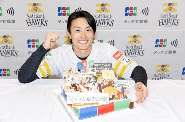 当日は、周東選手の30歳の誕生日当日ということで、佐久間支社長からのサプライズとしてバースデーケーキが用意されました。周東選手は「29歳も30歳も31歳も変わらないと思っています。“もう、30か”と言われるんですけど、若々しくスピード感あるプレーができたら」と今後の活躍への意欲を語りました。