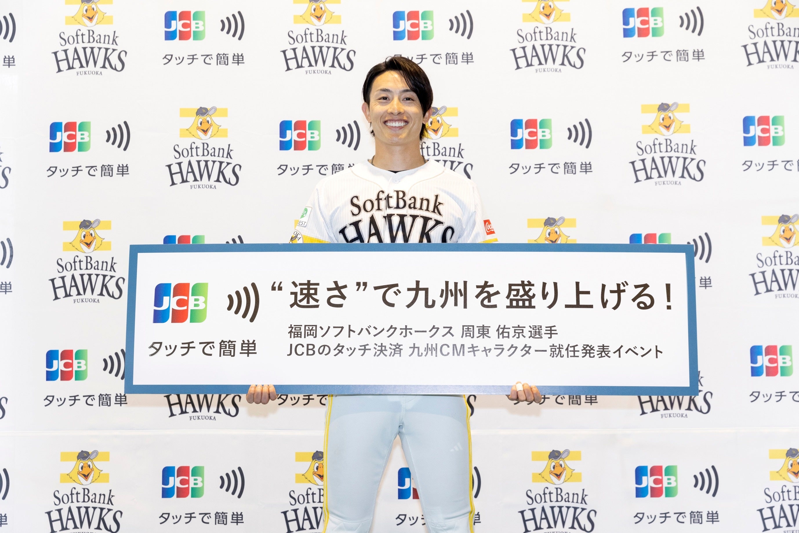 JCB 九州支社長の佐久間航也は周東選手をJCBのタッチ決済 九州CMキャラクターとして起用した理由として、「周東選手は、4回盗塁王を獲得した“圧倒的な速さ”のイメージがある選手です。JCBはタッチ決済の早さを市場により早く浸透させるために“速さの男“周東選手とともに今年1年、九州をタッチ決済で盛り上げていきたいと思います。」と語りました。