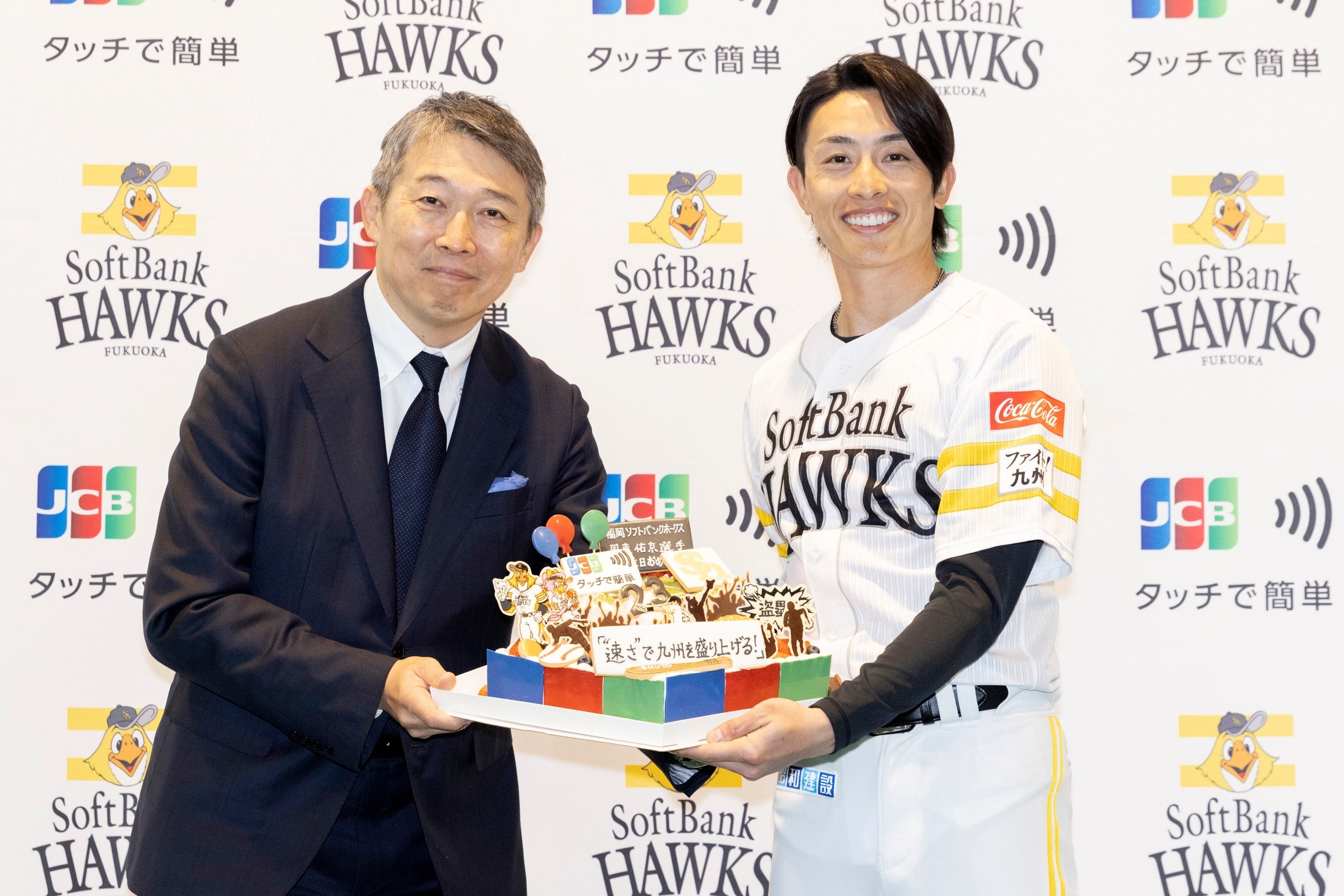 当日は、周東選手の30歳の誕生日当日ということで、佐久間支社長からのサプライズとしてバースデーケーキが用意されました。周東選手は「29歳も30歳も31歳も変わらないと思っています。“もう、30か”と言われるんですけど、若々しくスピード感あるプレーができたら」と今後の活躍への意欲を語りました。