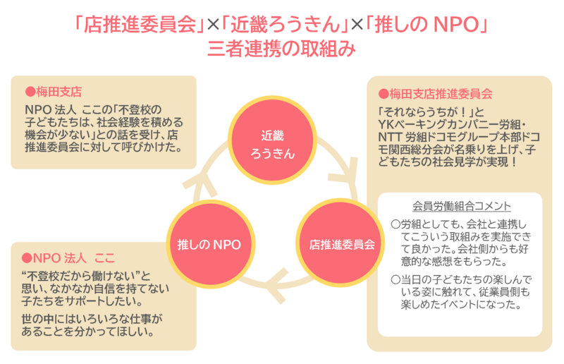 本プロジェクトを通じて、梅田支店推進委員会は、フリースクールを運営する「NPO法人 ここ」に通う子どもたちを、会員の職場に招待し、仕事体験や働く大人との交流を図る機会を提供しました。