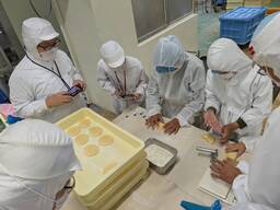 工場見学では、作業場を間近で見学できるよう準備され、それぞれの工程で社員の方からとても分かりやすい丁寧な説明がされました。パン製造体験では、社員の方の説明を聞きお手本を見ながら、全員がクリームパン製造の一連の作業を体験しました。