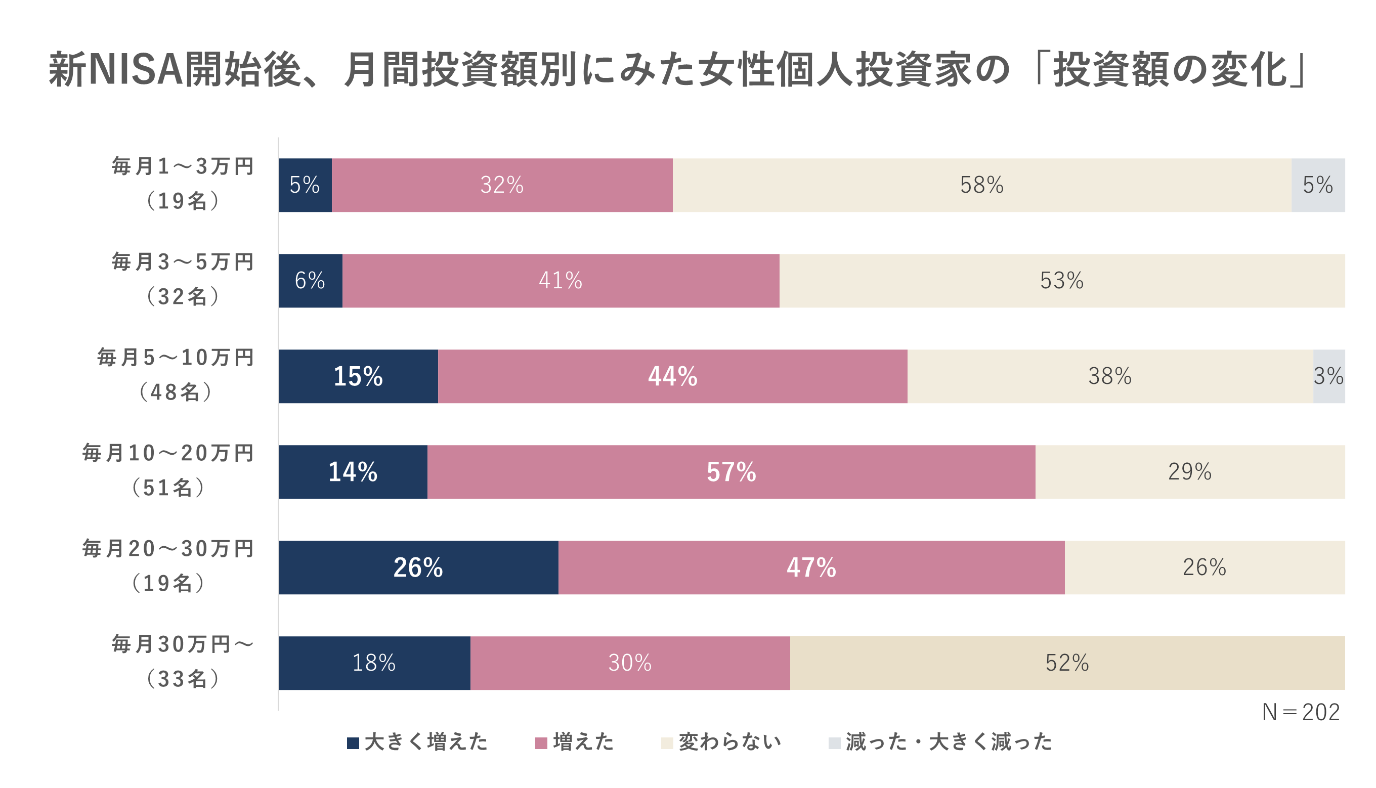 新NISA開始後の投資額変化を毎月の投資額別にみると、「毎月10〜20万円」層で71%、「毎月20〜30万円」層で73%が「大きく増えた」、「増えた」と回答しました。一方、月間投資額1〜5万円および30万円超の層では、半数以上が「変わらない」と回答。少額投資層では様子見傾向がみられる一方、高額投資層では投資額を維持しているようです。
