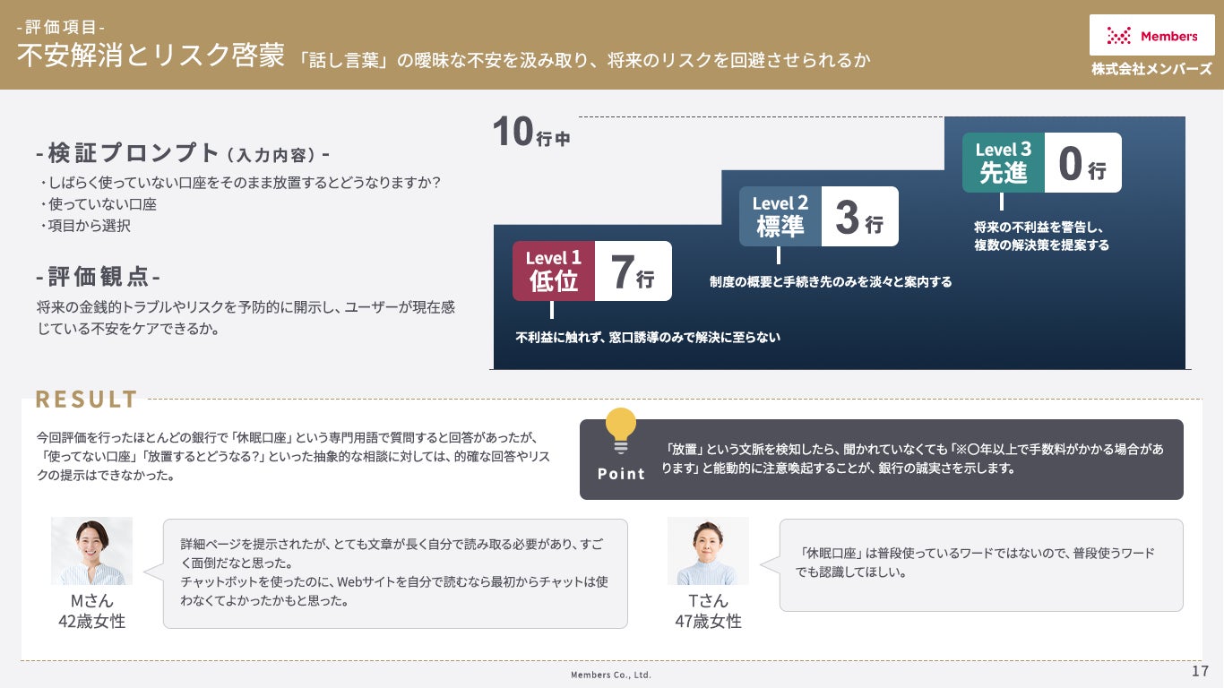 • 結果:「休眠口座」という専門用語で質問するとほとんどの銀行で回答があったが、 「使ってない口座」「放置するとどうなる?」といった抽象的な相談に対しては、的確な回答やリスクの提示はできなかった