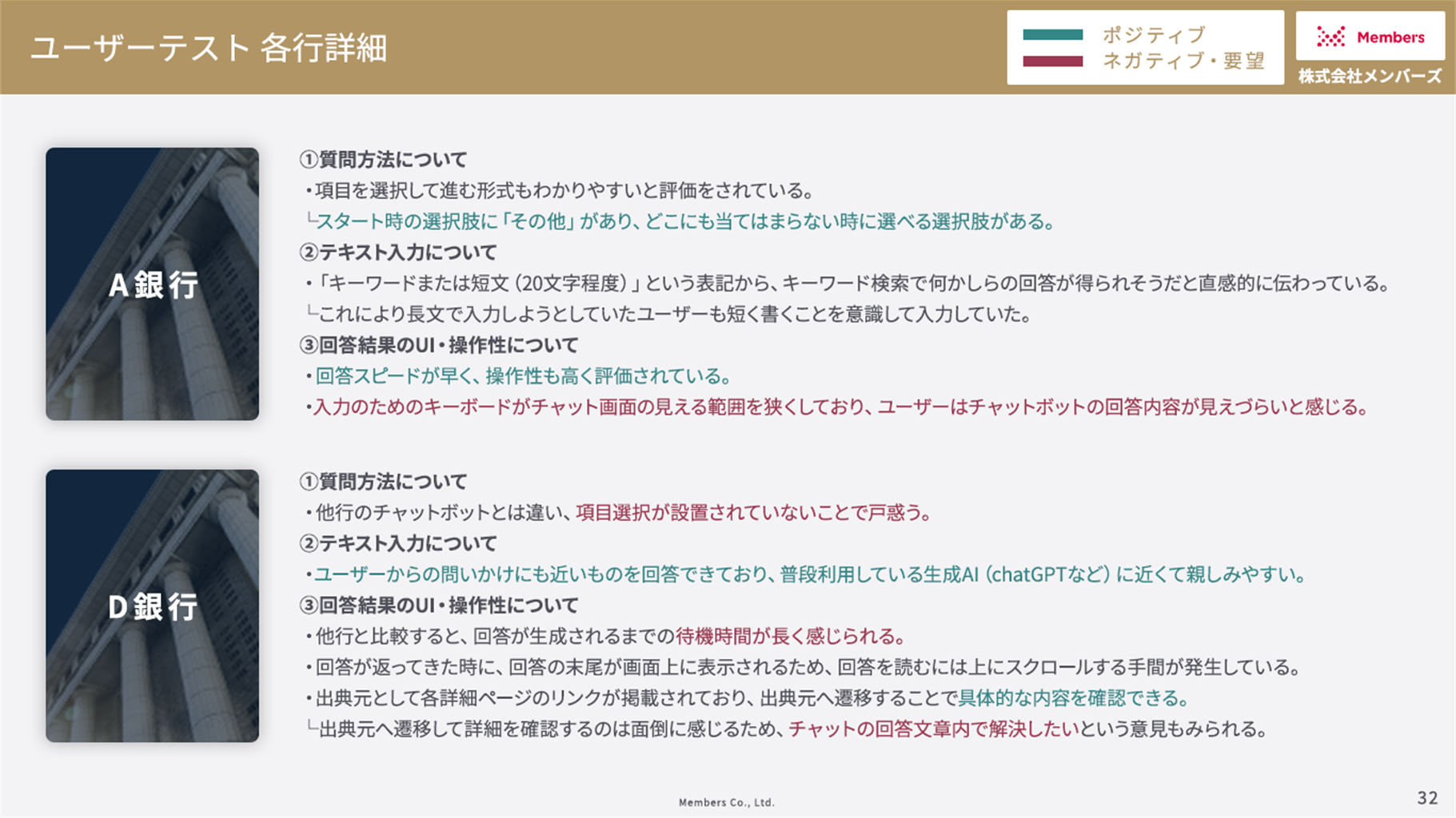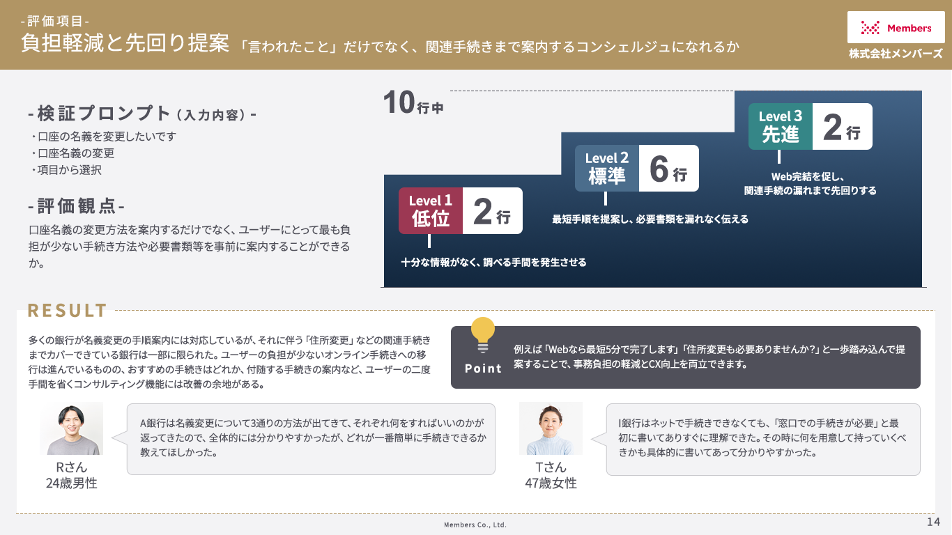 • 調査方法:各行の一般に公開されている顧客向けAIチャットボットのスコアリングとユーザーテストを実施し、評価