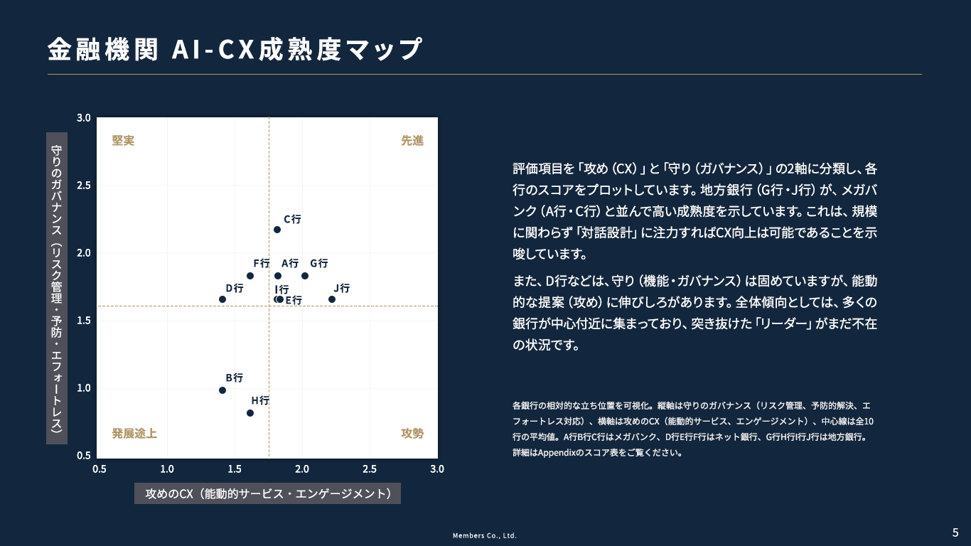 • 全体傾向として、多くの銀行が中心付近に集まっており、突き抜けた「リーダー」がまだ不在の状況