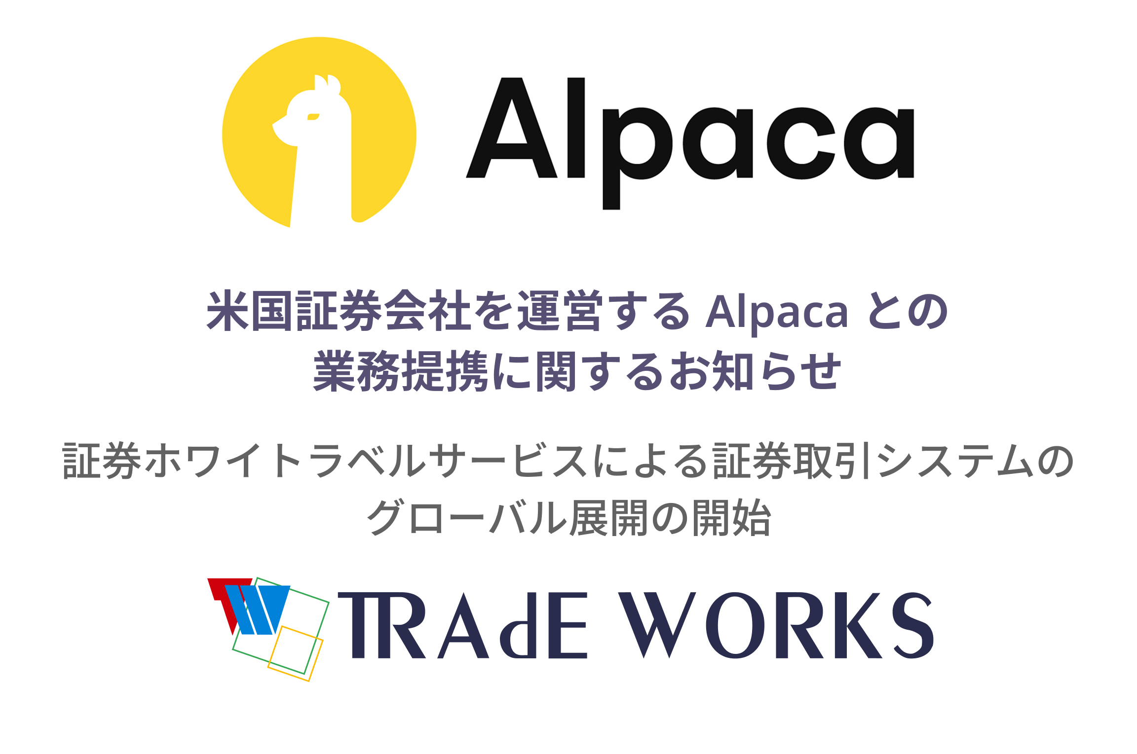 金融システム開発やAI・セキュリティ・ブロックチェーンなどの先端技術を活用したソリューションを提供する株式会社トレードワークス(以下「当社」、本社:東京都港区、代表取締役社長:齋藤正勝)は、AlpacaDB Inc.およびそのグループ企業(以下「Alpaca」、本社:米国カリフォルニア州サンマテオ、CEO 横川 毅)との間で、証券ホワイトラベルサービスの提供を目的とした業務提携契約を締結いたしました。米国株式の取引サービスを中核にアジアおよび中東諸国を皮切りとしたグローバル市場での展開を開始します。