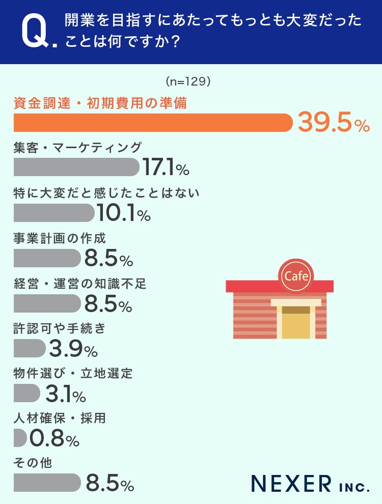 もっとも多かったのは「資金調達・初期費用の準備」で39.5%と、ほかの項目より大きく上回りました。次いで「集客・マーケティング」が17.1%、「事業計画の作成」と「経営・運営の知識不足」がそれぞれ8.5%という結果です。