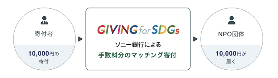 ソニー銀行が協賛する「GIVING for SDGs」では、NPO団体が取組むプロジェクトへの寄付にかかる手数料をソニー銀行がマッチング寄付をすることで寄付金の100%をNPO団体へ届けています。支援者による寄付金の還元性を高めることで、寄付文化の浸透およびNPO団体の社会課題解決に向けた活動を支援することにつなげています。
