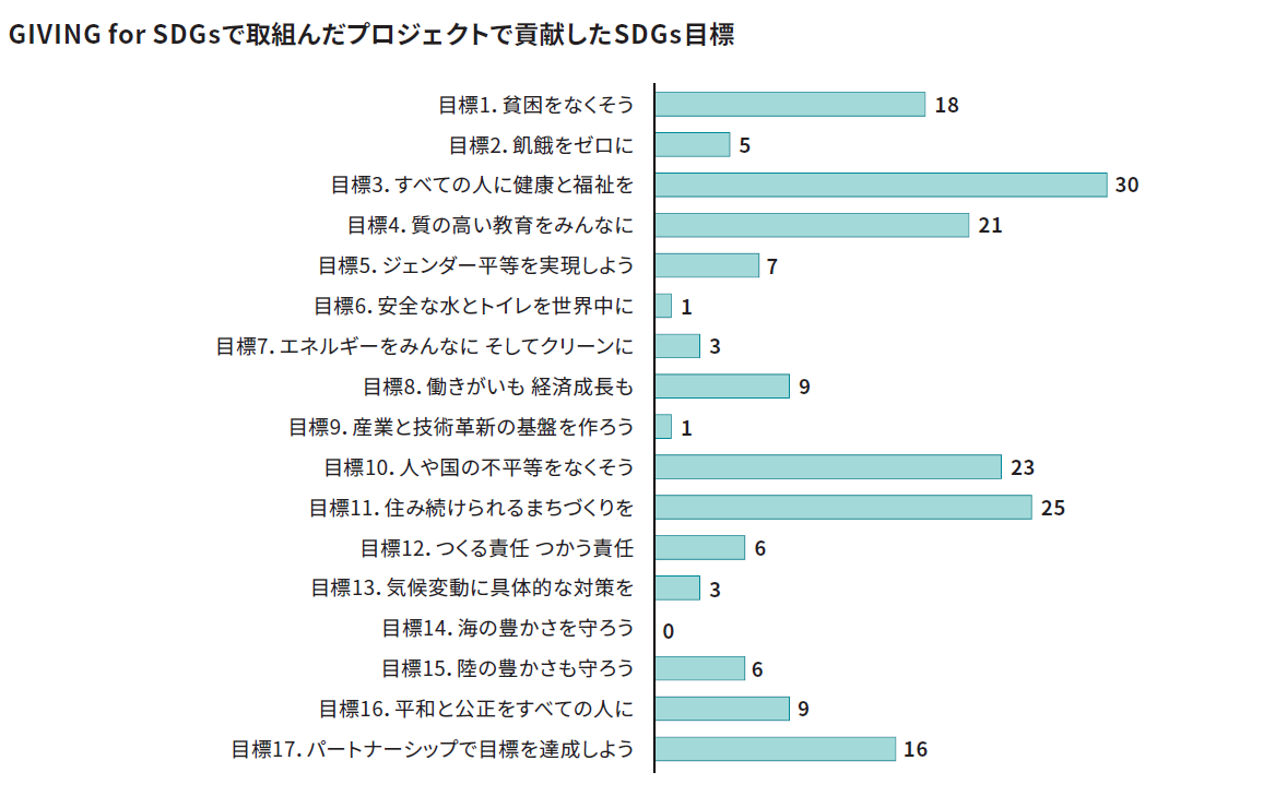 これまで「GIVING for SDGs」を通じて取組まれたプロジェクトでは、子どもの健全育成や貧困対策をはじめ、まちづくり、環境保全、人権・平和推進など幅広い分野における社会課題解決を目指す活動が実施され、多くのご支援をいただいています。今回、取組プロジェクトが50件を達成、また支援総額が1億2,000万円超、総支援者数が7,600人を突破したことは、多くのかたによる持続可能な未来を実現するための関心と行動が広がっているものと考えています。