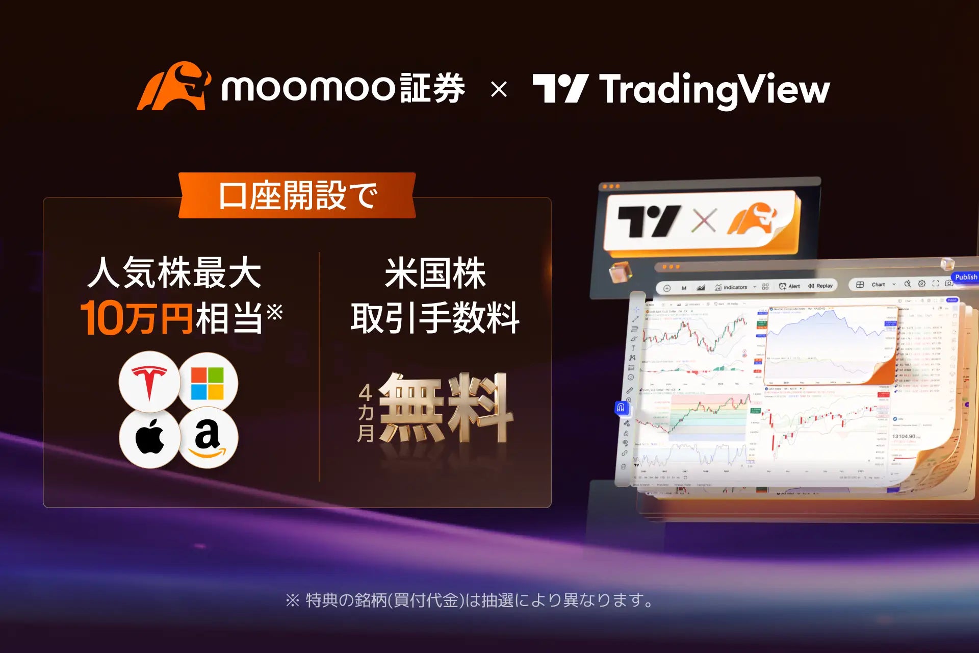 TradingViewとの接続開始を記念し、米国株手数料が4カ月無料&最大10万円相当の人気株がもらえるキャンペーンを実施しています。キャンペーンの詳細はこちらからご確認ください。