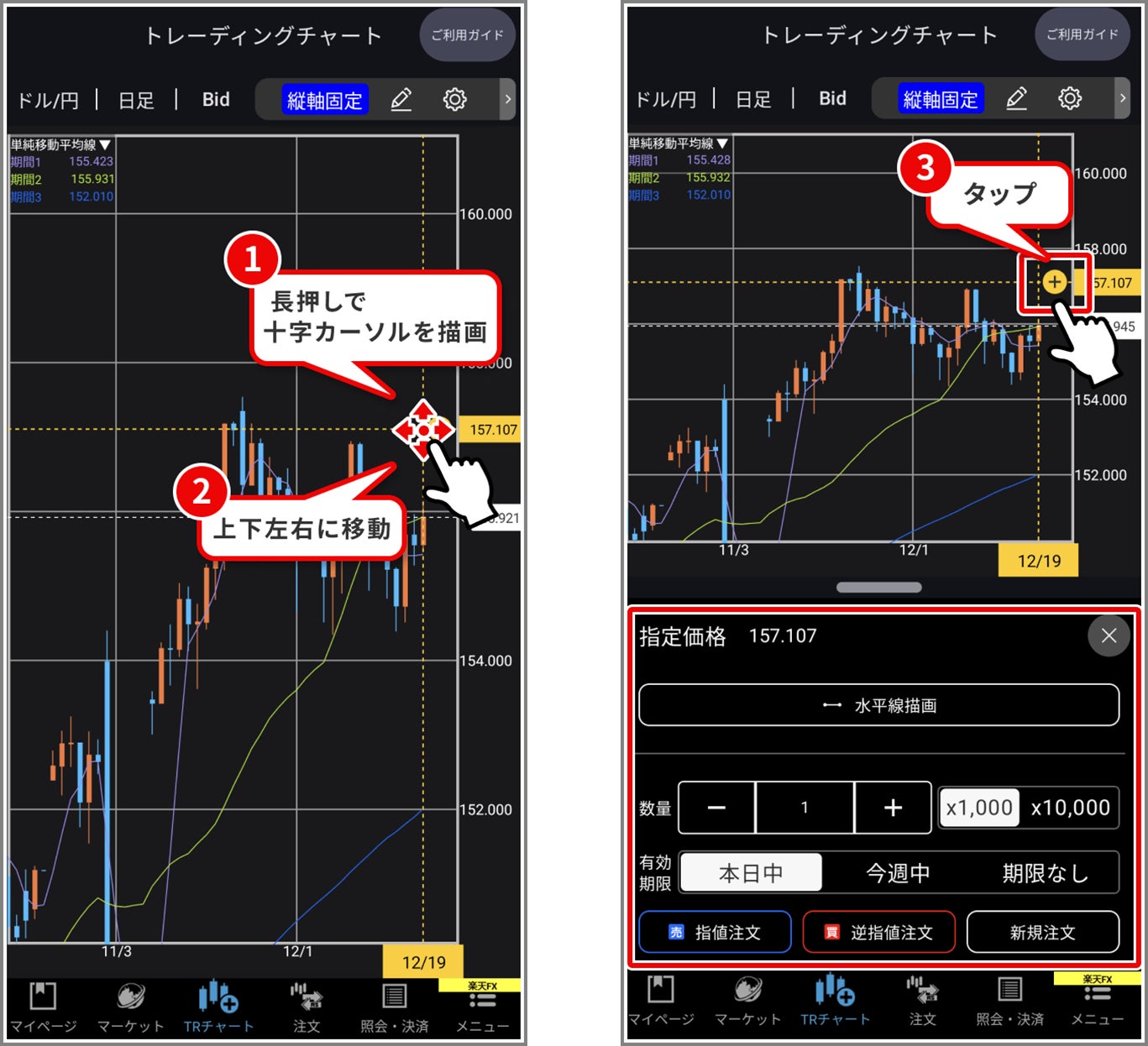 十字カーソルをチャート上で上下に動かして価格を決めて、ワンタップで新規注文画面を表示可能