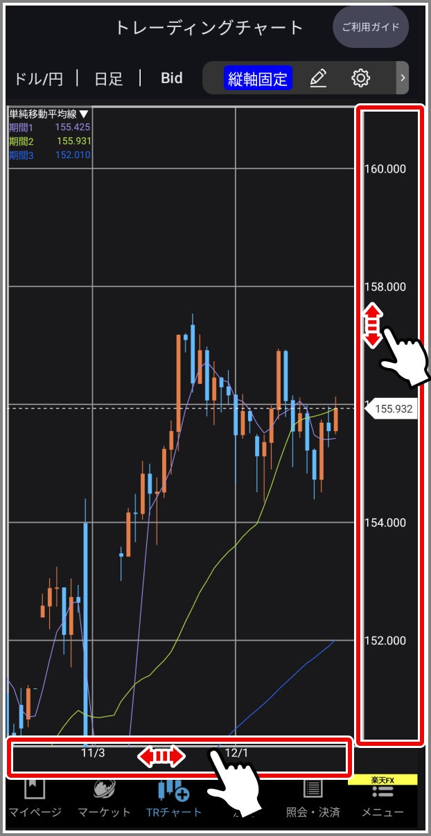 時間軸と価格軸の表示拡大・縮小を、縦軸と横軸を上下左右にスワイプすることで調整可能に