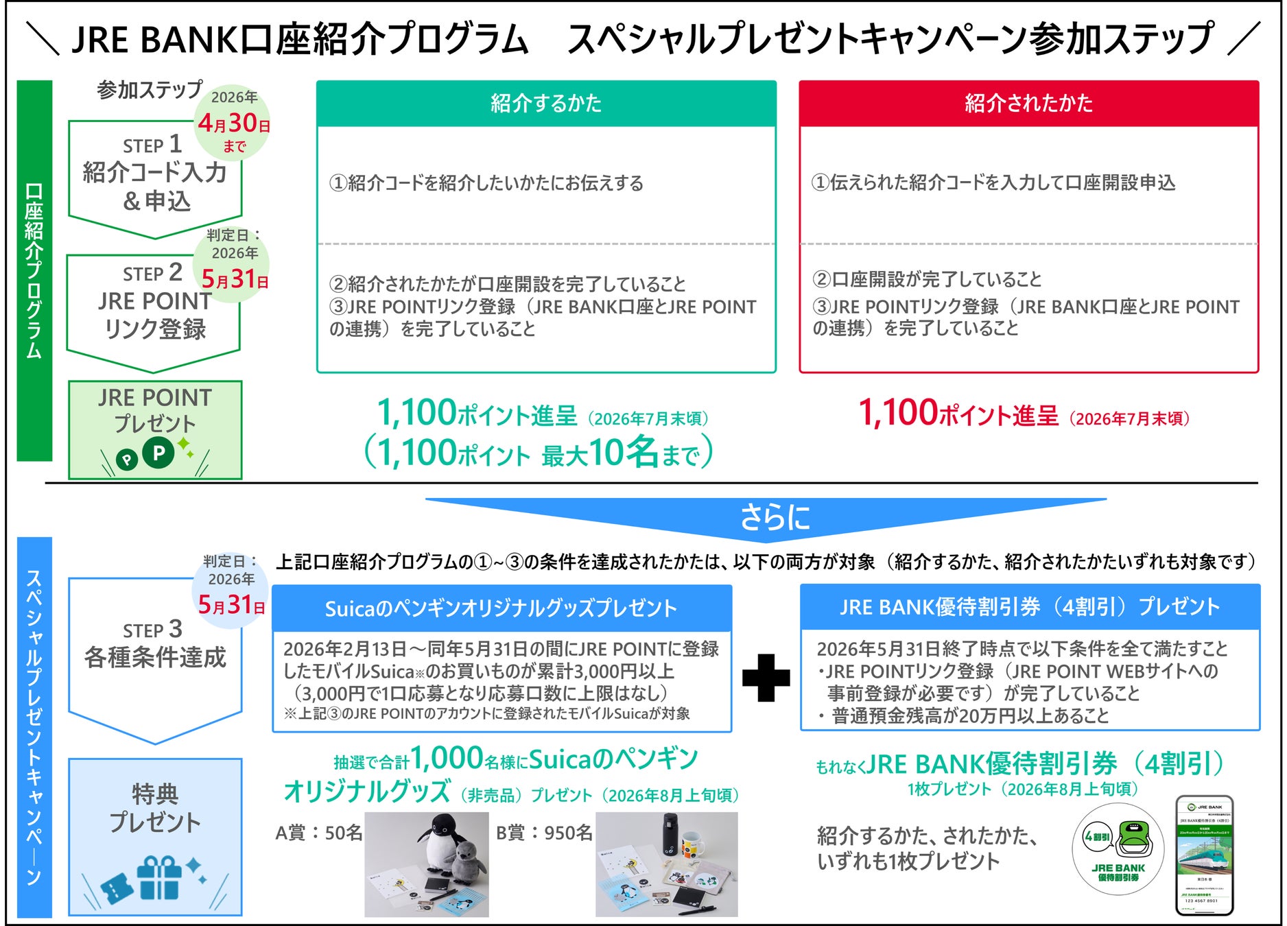 ※JRE BANK口座紹介プログラム スペシャルプレゼントキャンペーンの詳細につきましては、キャンペーンページをご覧ください。