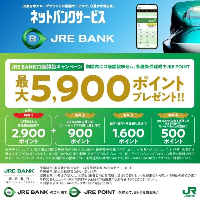 JRE POINTが最大5,900ポイントもらえるJRE BANK口座開設キャンペーンも各種条件達成で対象となります。詳細につきましては、キャンペーンページをご覧ください。