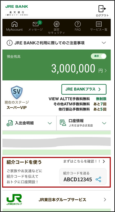 紹介コードとは、ご家族やお友達などがJRE BANK口座を開設する際に、申込フォーム内の紹介コード入力欄に入力していただく、口座ごとに割り振られたお客さま専用のコードです。メールや、普段よく利用するメッセージ送信アプリから紹介コードを送信できます。