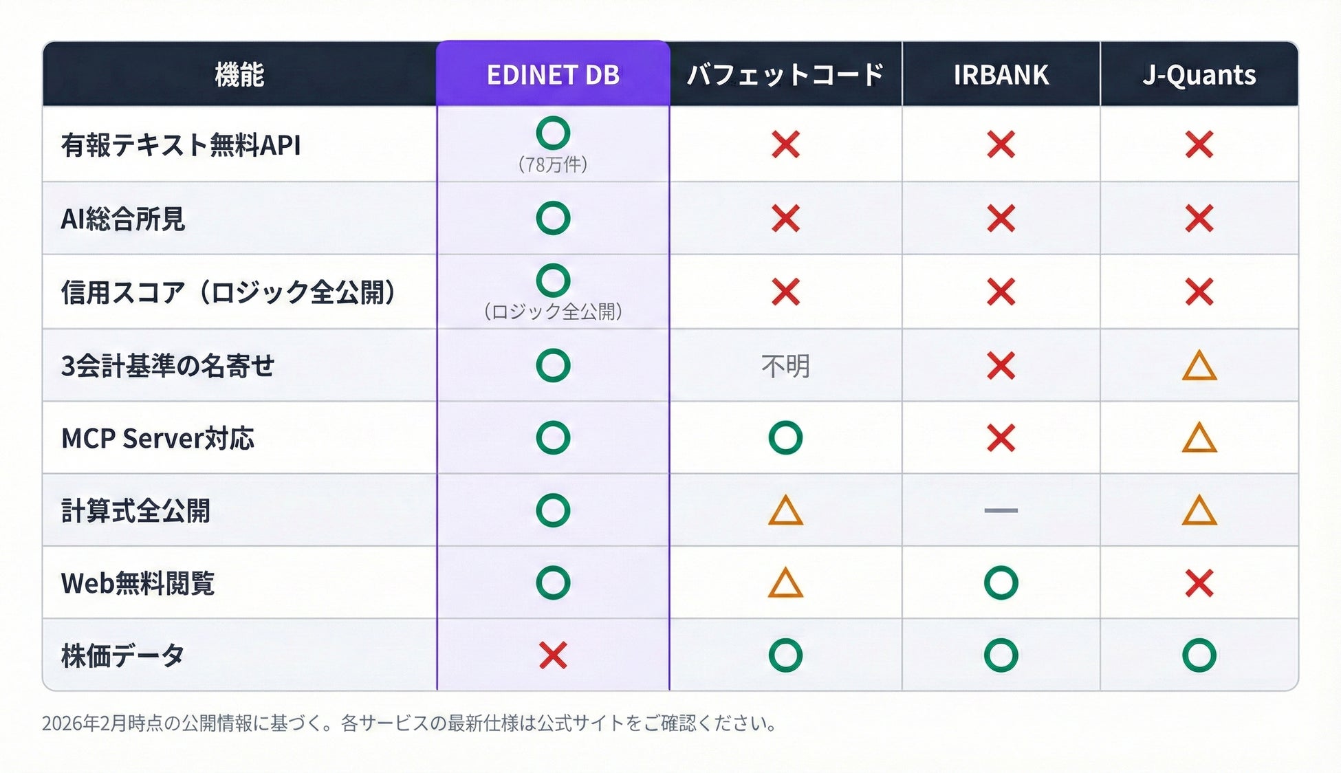 EDINET DBは有報データの構造化とAI分析に特化したサービスです。日本の財務データ分野の既存サービスとの違いを以下に整理します。