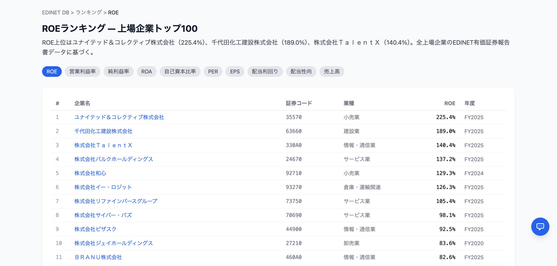 全3,848社を各種指標(ROE、売上高、信用スコア、etc…)でランキング表示。登録不要で閲覧可能