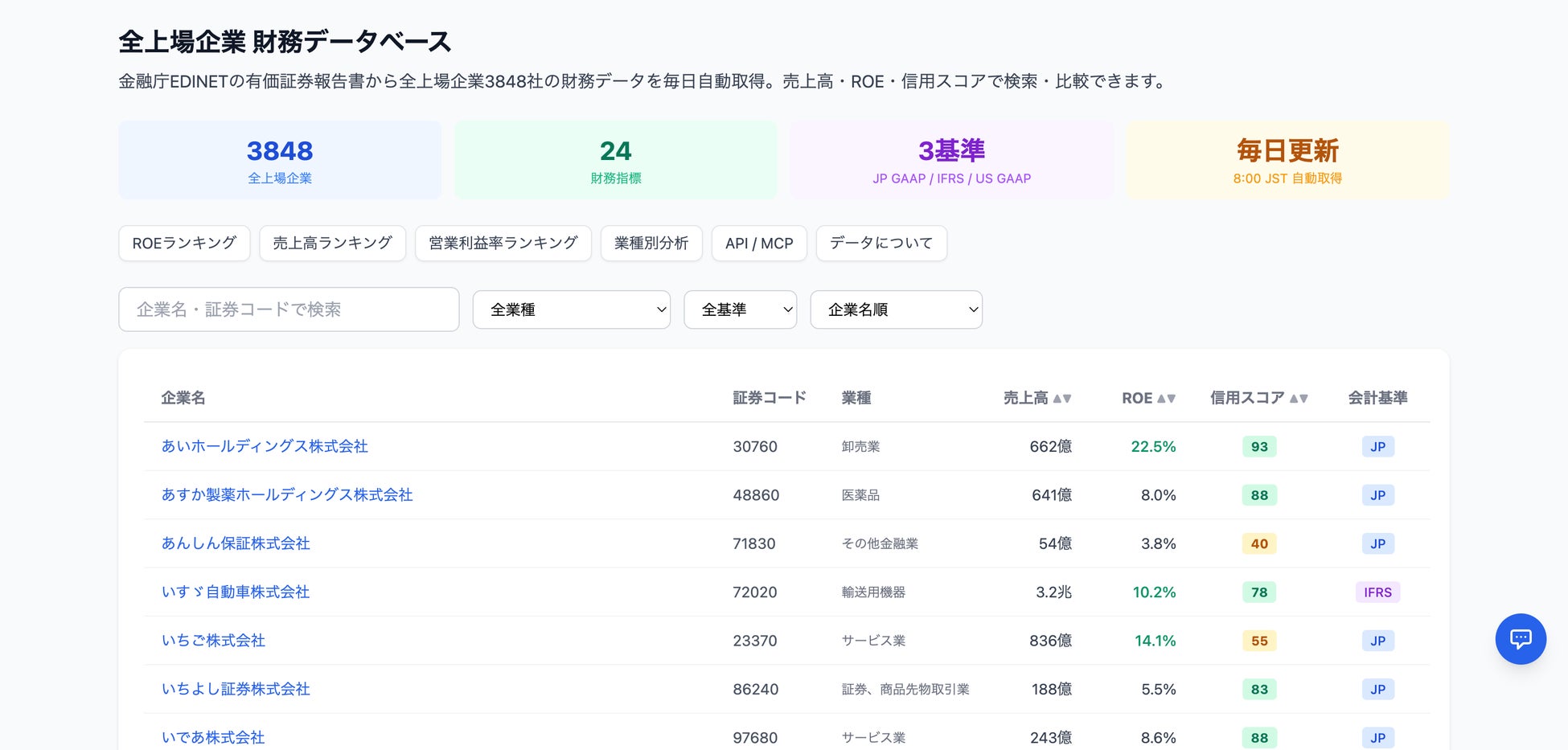 3会計基準を横断して名寄せ済みの日本株財務データ。毎日更新。