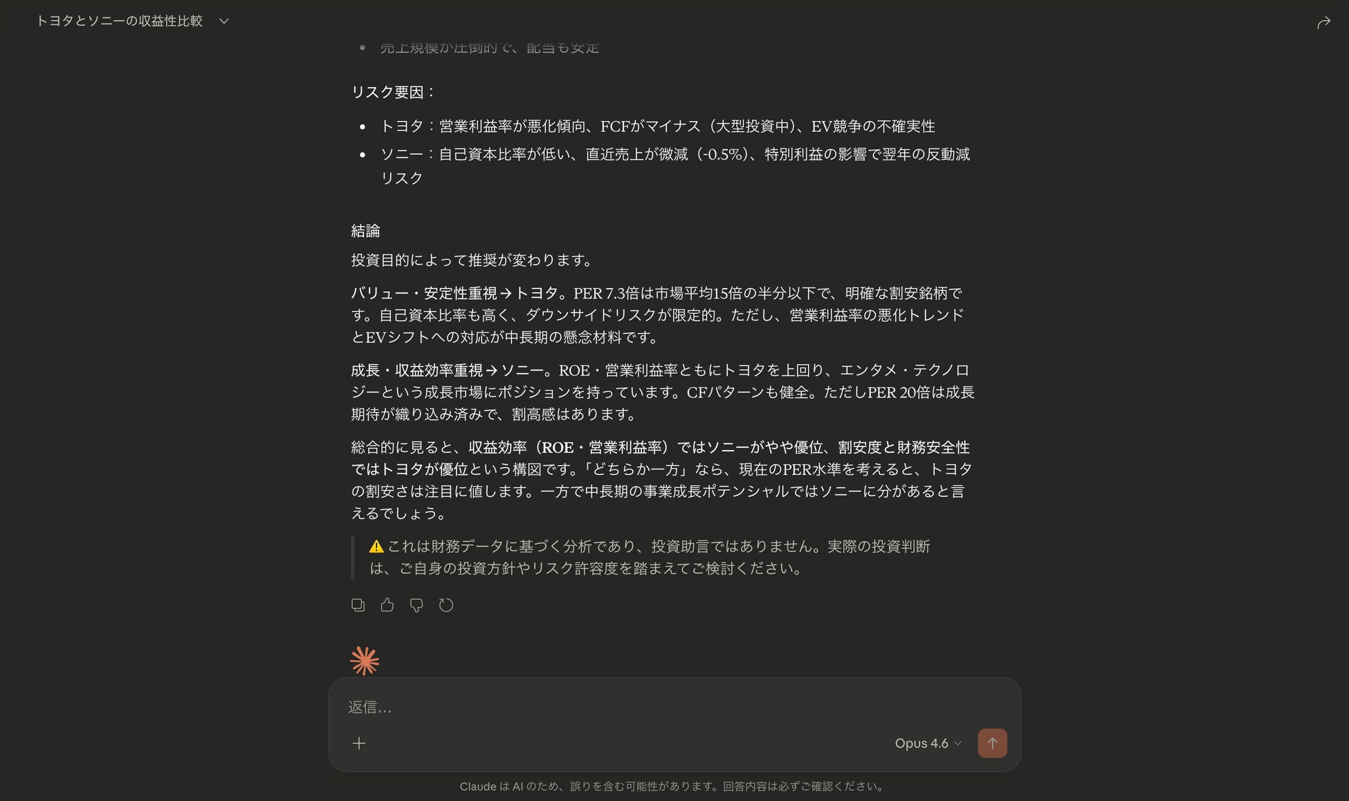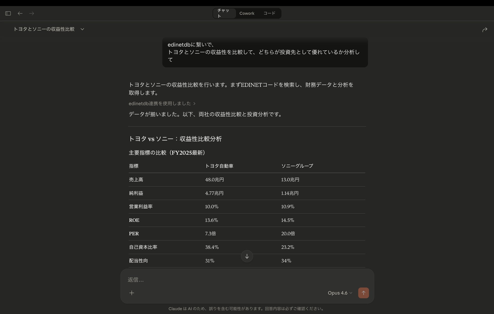Claude DesktopからEDINET DBのデータを呼び出し、企業分析を実行している画面 2