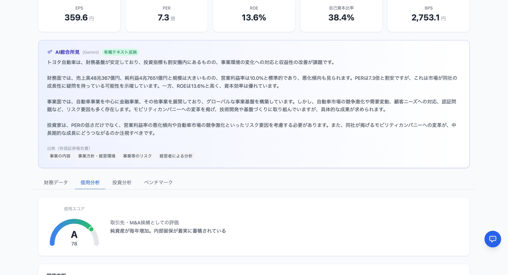 定量・定性情報をAI(Gemini)が統合分析し、企業ごとに総合所見を生成(トヨタ自動車)