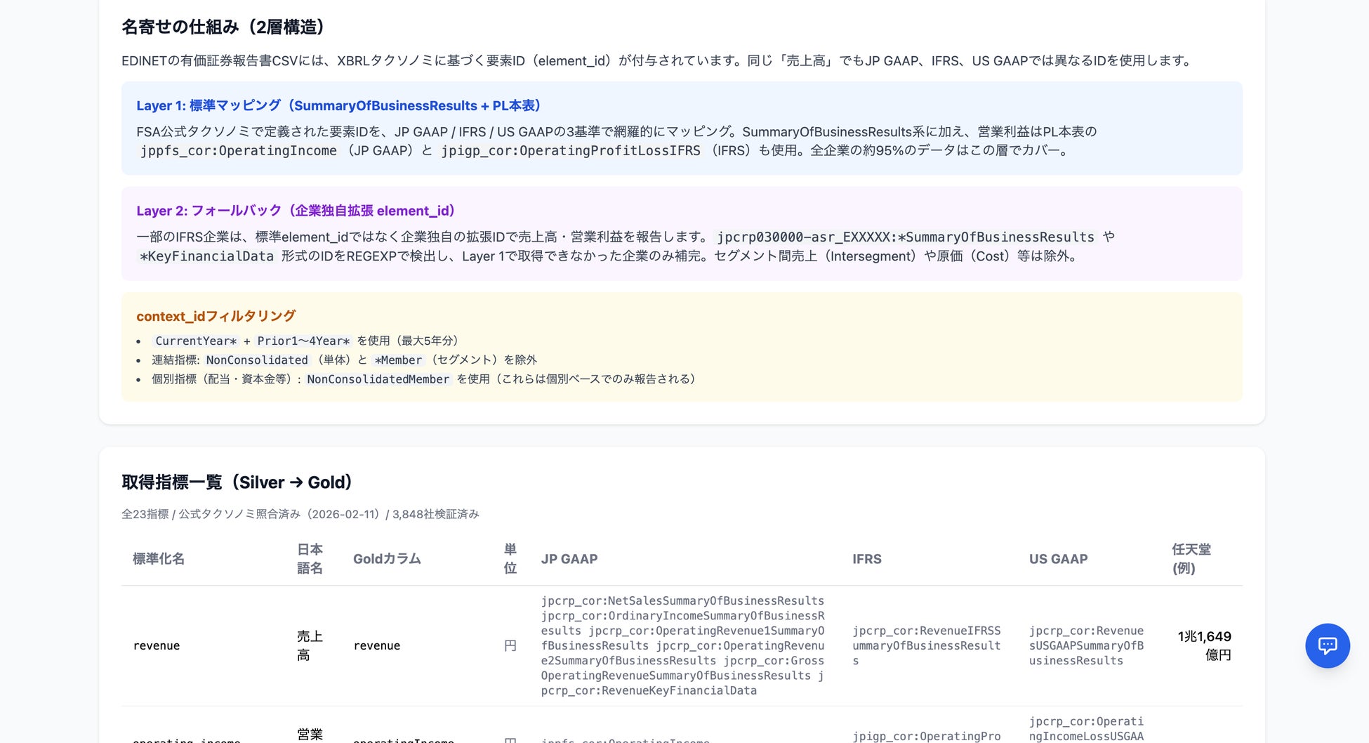 全3,848社×最大6年分(FY2020〜FY2025)のデータを収録。名寄せのマッピング定義(各会計基準の科目ID対応表)はサイト上のドキュメントページ(/docs/metrics)で全て公開しており、どの基準のどの科目がどう統合されているかを確認できます。