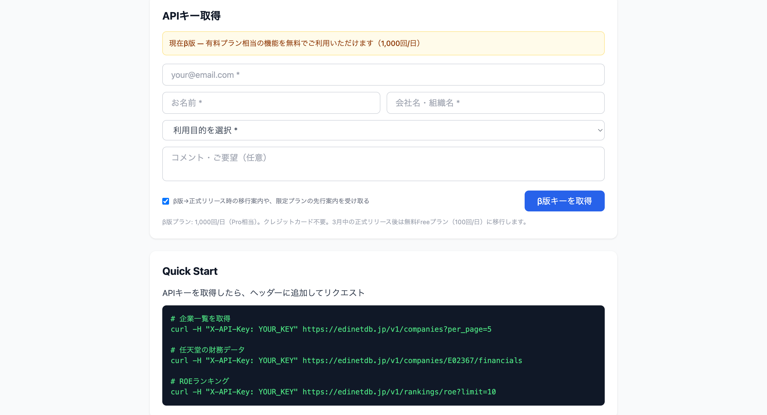 β期間中(2026年2月〜3月中の正式リリースまで)にご登録いただいた方には、Pro相当の機能(API 1,000件/日)を無料で開放します。正式リリース後も特別な優待を予定しています。