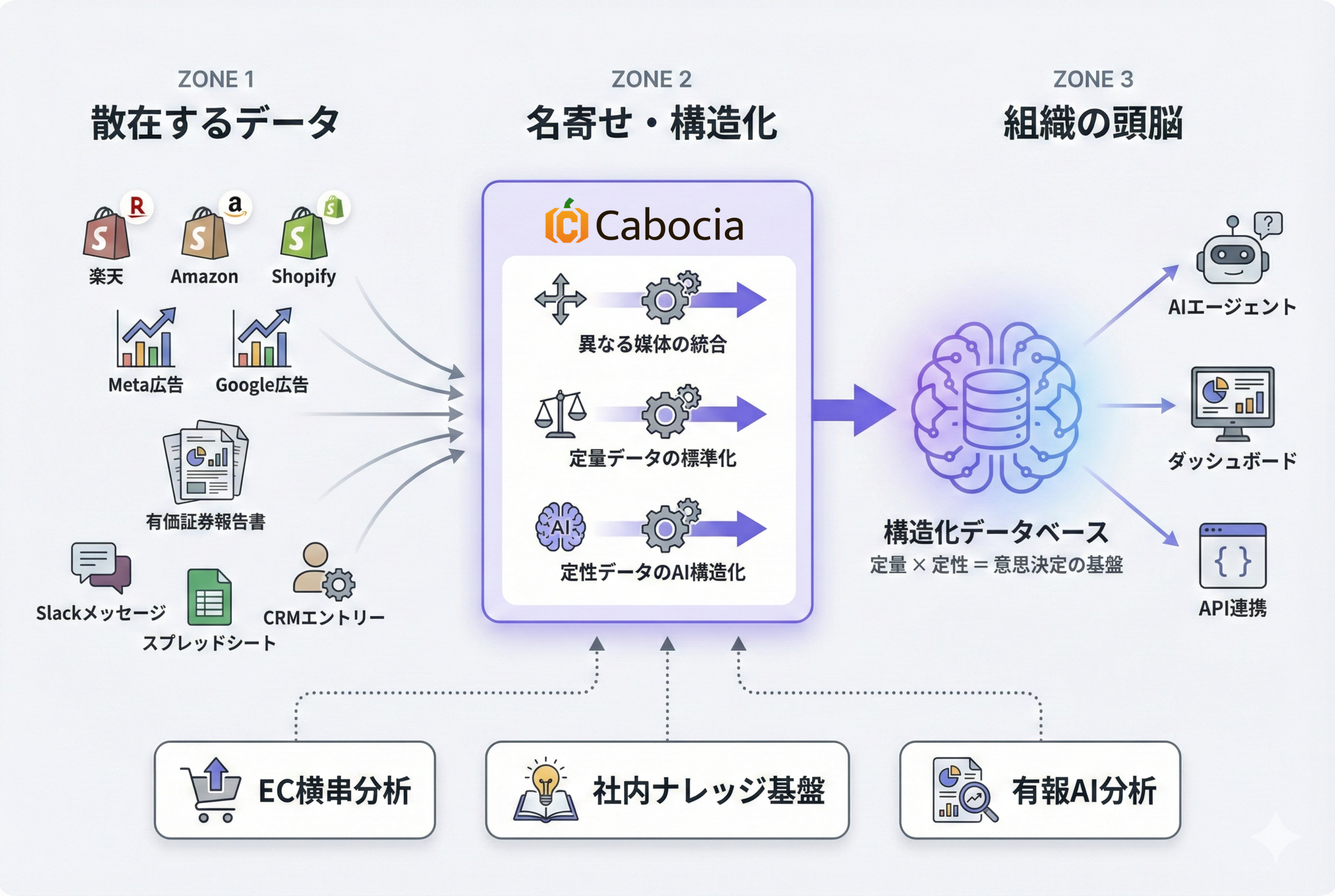 Cabociaは、上場企業を含む法人向けにデータ分析基盤の構築やAIエージェントの導入を手がけている会社です。代表はEC事業者向けの異なるモール・媒体のデータ名寄せや横串分析を設立前から続けており、設立後はECだけでなく、コンサルティング会社やマーケティング会社向けに、社内ナレッジを構造化してAIエージェントから参照可能にする基盤も提供しています。