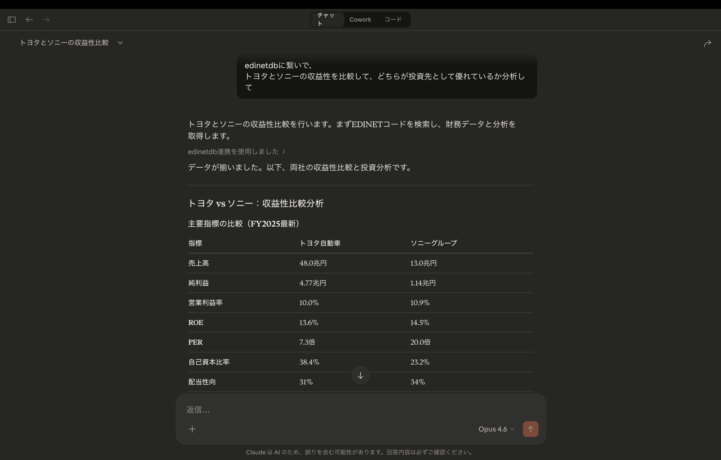 Claude DesktopからEDINET DBのデータを呼び出し、企業分析を実行している画面 2