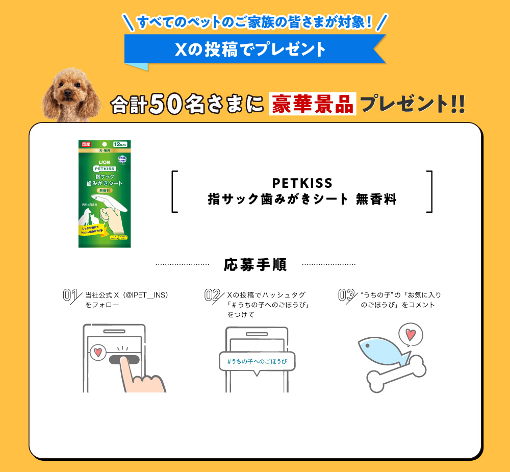 そして、今回はXでのキャンペーンも同時開催します。ご成約者さまに限らず、すべてのペットのご家族の皆さまにも、抽選で50名さまに指サック歯みがきシートをプレゼントします。