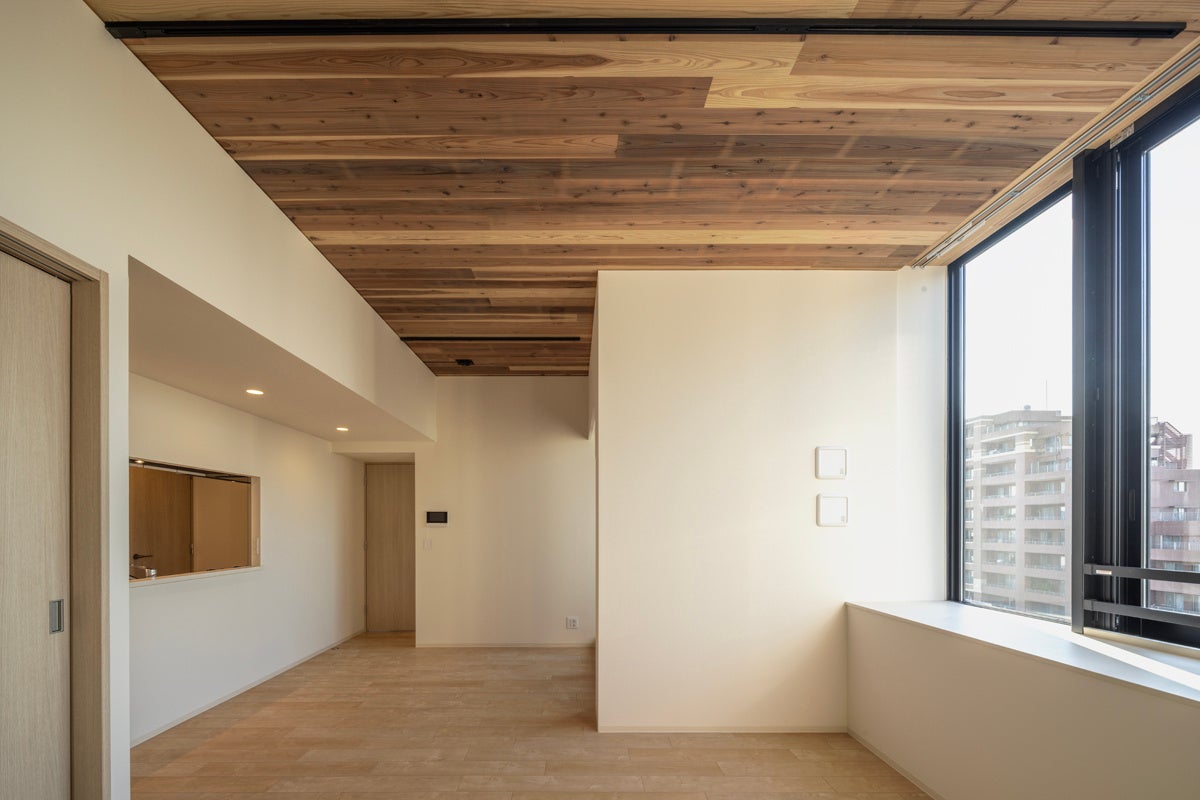 住戸の内装は、RC床スラブ(鉄筋コンクリート床)の型枠に天然木を使用し、そのまま仕上げ材として活かす「ハイウッドスラブ」を採用したことや、通常は天井側に下がる梁を床側に立ち上げて設置する工法である「逆梁構法」を採用したことで、住戸リビング・ダイニングは賃貸マンションとしては類例の少ない天井高さ約2.8mとなる天然木天井を実現しました。窓側に下天井がないため視界が開け、空が大きく感じられる、明るく開放的な居住空間となっています。