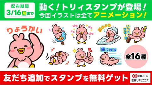 三菱UFJニコスはこのたび、三菱UFJカードのプロモーションキャラクター「トリィ」の公式LINEスタンプ最新作(全16種類)を2月17日から3月16日まで無料で配信します。