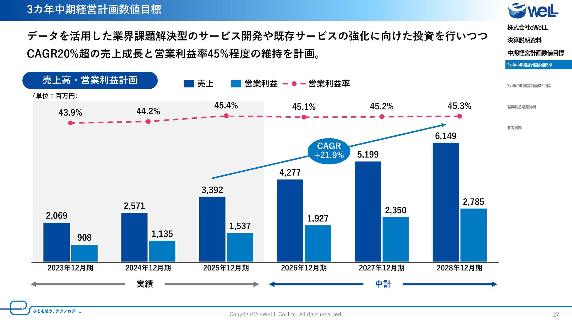 中期経営計画の中では、引き続き20%を超える売上高成長と高い営業利益率を両立する事業モデルにより、安定的かつ高いキャッシュフローを創出できる事業構造を有しております。
