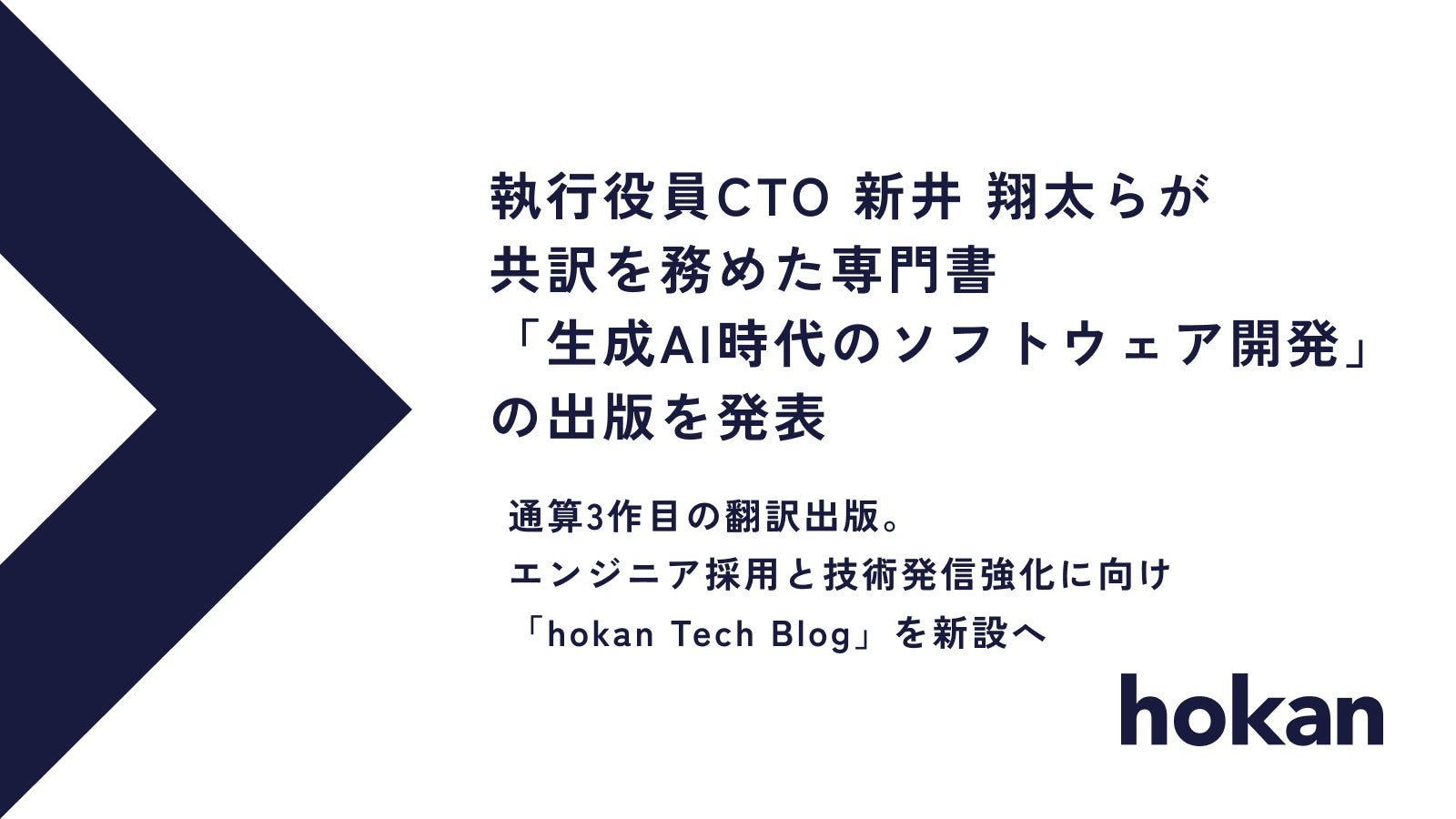 「適正な営業活動」と「組織の強固な監査体制」を実現するクラウド型保険代理店システム「hokan®︎」を提供する株式会社hokan(ホカン、本社:東京都中央区、代表取締役社長:横塚 出、以下:当社)は、2026年2月に執行役員CTO(Chief Technology Officer)に就任した新井 翔太(以下:新井)が共訳者として参画した専門書「生成AI時代のソフトウェア開発」(オライリー・ジャパン)が、2026年1月に出版されたことをお知らせいたします。