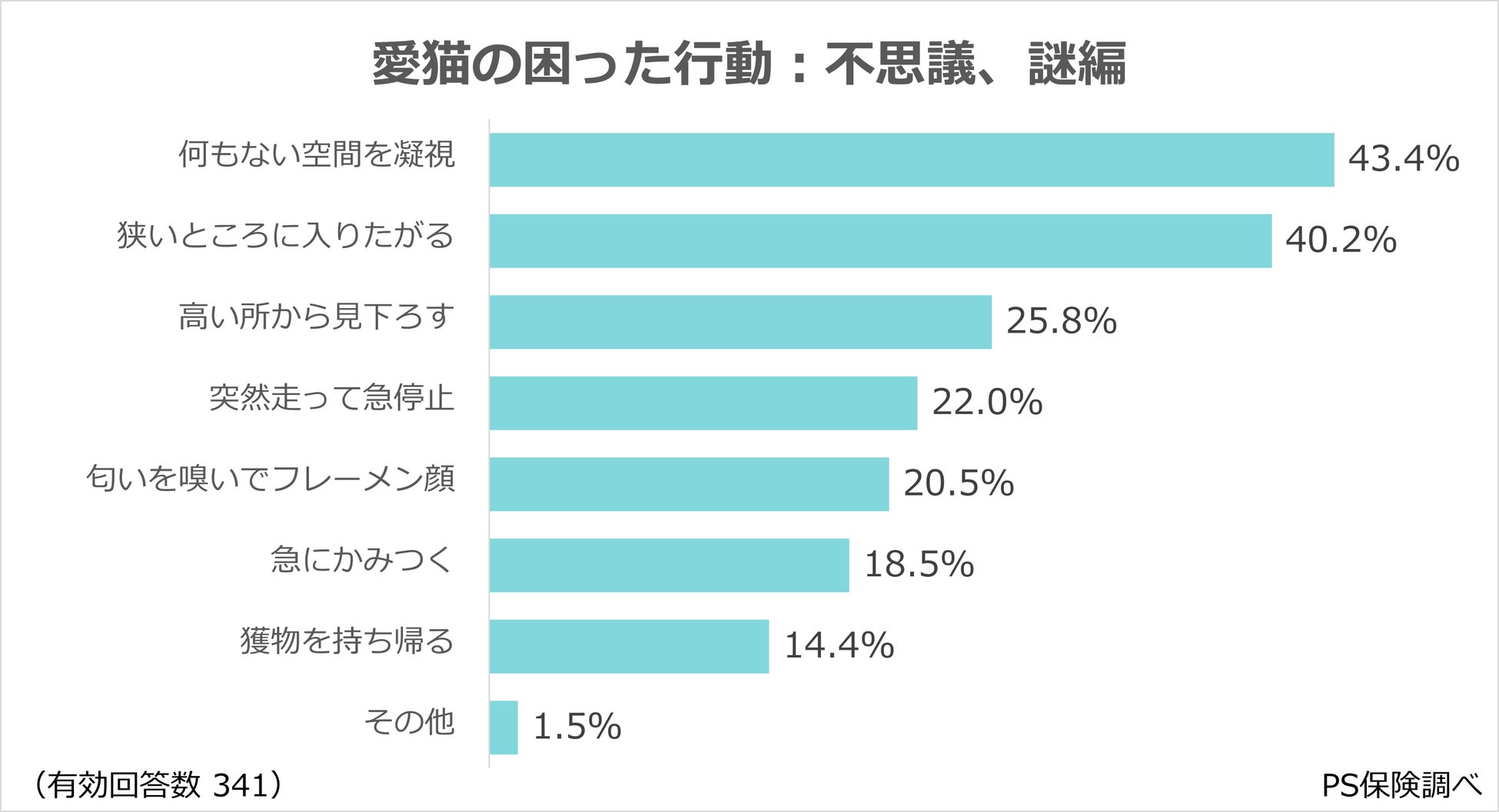 ・不思議、謎編:「何もない空間を凝視する」(43.4%)が最多。意味不明で不可解な行動で飼い主を困惑させる。