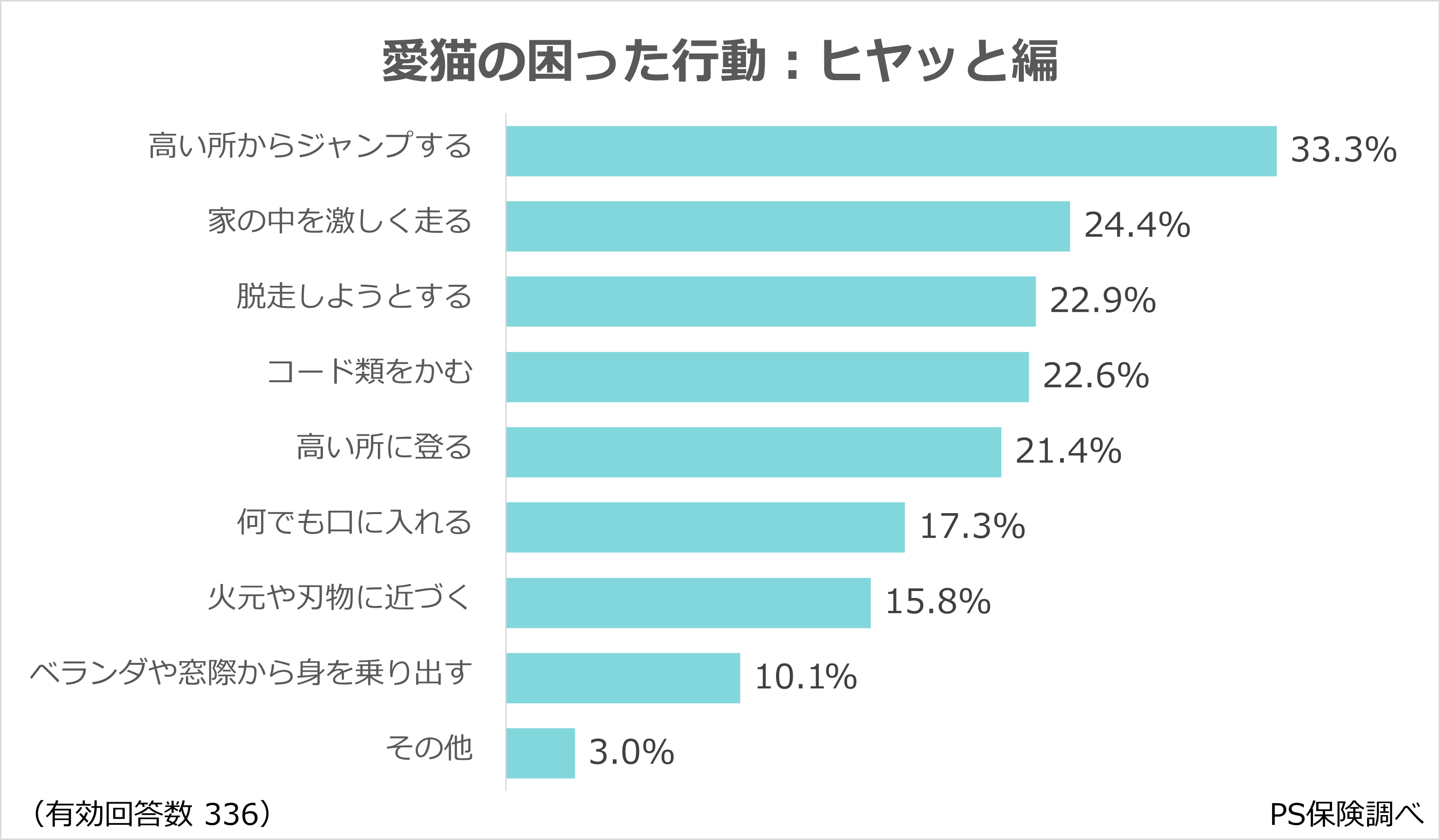 「高い所からジャンプする」(33.3%)が最多でした。次いで、「家の中を激しく走る」(24.4%)、「脱走しようとする」(22.9%)が続きます。いずれも猫の本能や習性に基づく自然な行動ですが、状況によっては思わぬ事故につながることもあり、飼い主がヒヤッとしやすい行動と言えます。