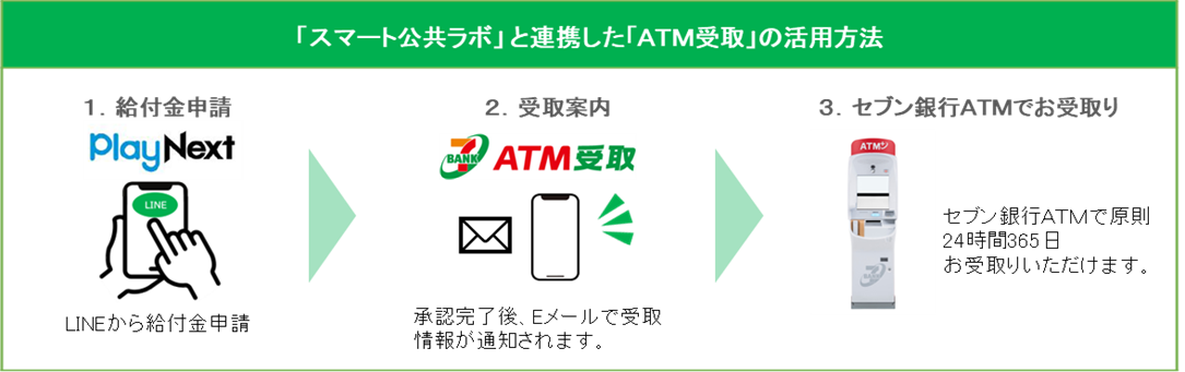 また、このたびプレイネクストラボ株式会社(本社:東京都品川区、代表取締役社長:柏 匠)が提供する「スマート公共ラボ」*2と連携を行うことで、スマートフォンで申請し、お近くのATMで受取りというデジタルとリアルがシームレスに融合した利便性を提供します。これにより、住民の皆さまはLINEアプリから給付金の申請を完結できるようになります。