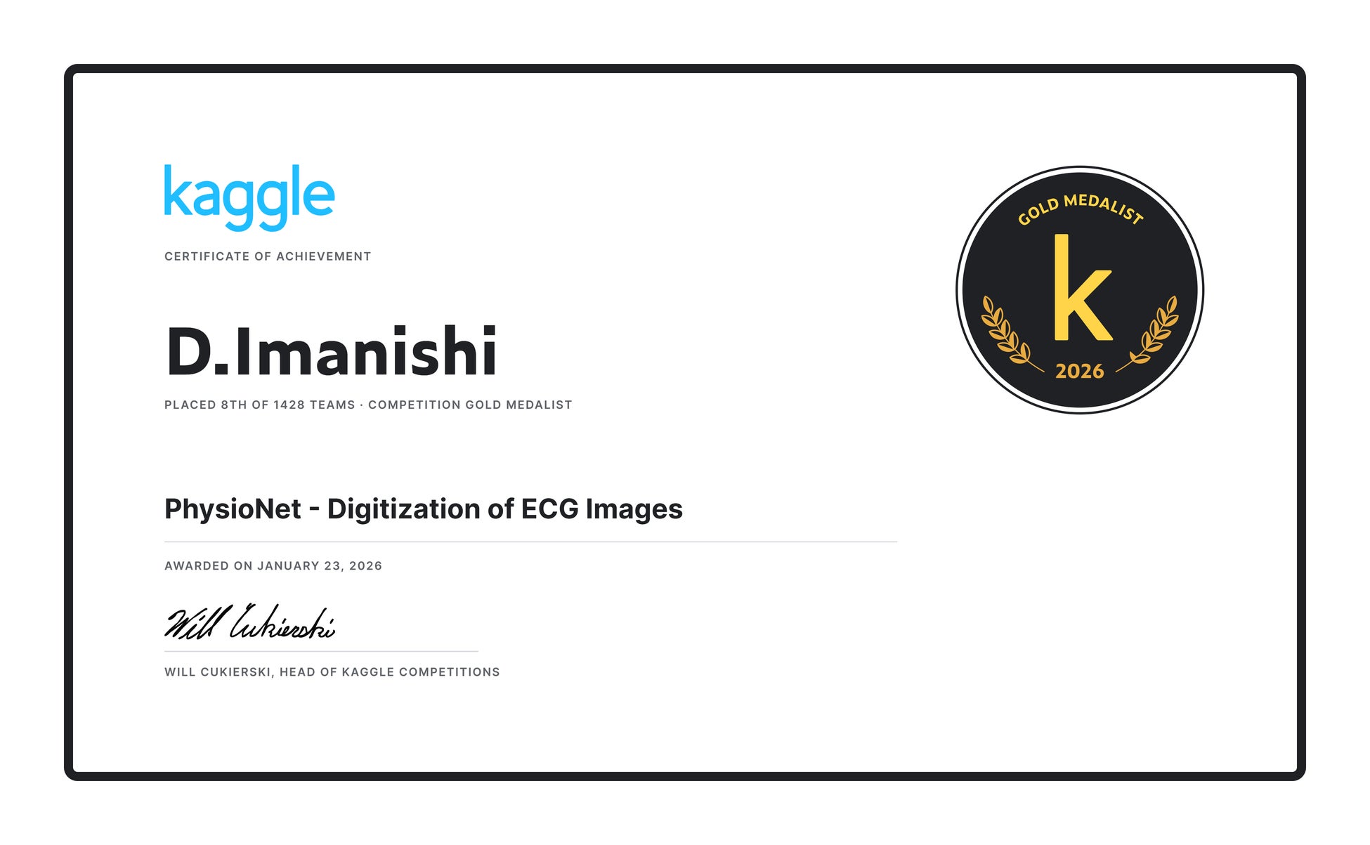 Japan Digital Design株式会社(代表取締役CEO:岩田 廉平、以下:JDD)のデータサイエンティストであり、Kaggle最上位称号「Grandmaster」を有する今西 大輔が、データ分析の世界大会Kaggleの医療分野の社会課題をテーマとした「PhysioNet – Digitization of ECG Images」において金メダルを獲得しました。