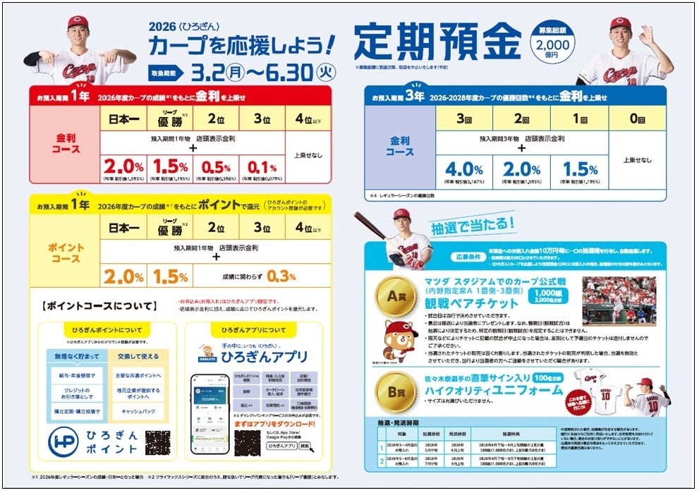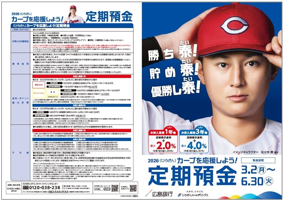 株式会社広島銀行(頭取 清宗 一男、以下「当行」)は、広島東洋カープ(以下「カープ」)の活躍の後押しと地域の活性化への貢献を目的として、今年も「〈ひろぎん〉カープを応援しよう!定期預金」の取扱いを開始します。