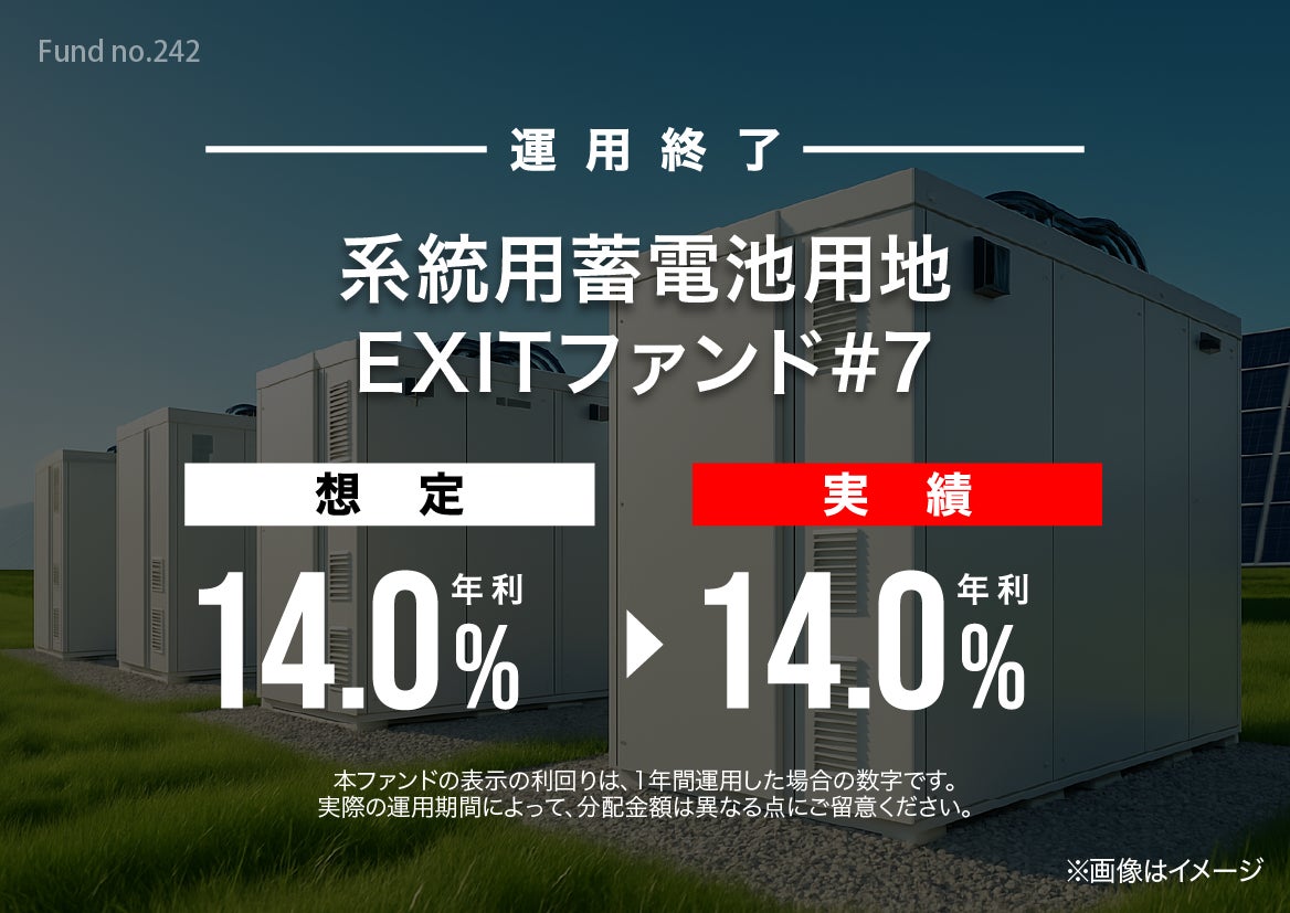 不動産クラウドファンディングサービスを展開する「ヤマワケエステート株式会社」(本社:大阪府大阪市、代表取締役:梅本 拓磨、以下、「当社」)がファンドを組成した 『系統用蓄電池用地 EXITファンド#7』の償還及び配当が完了したことをお知らせいたします。