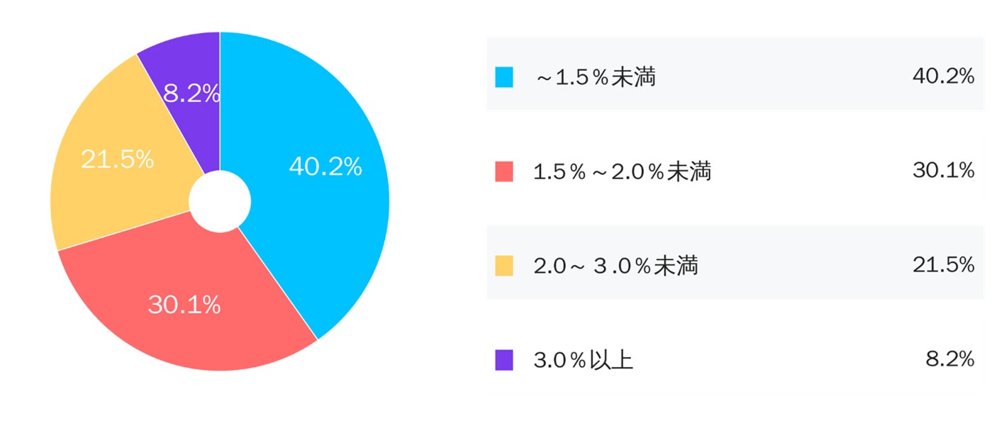 ・「~1.5%未満」が40.2%と最も多く、「1.5%~2.0%未満」が30.1%、次いで「2.0%~3.0%」が21.5%となりました。「3.0%以上」との回答の中には、10%以上とのお声もありました。