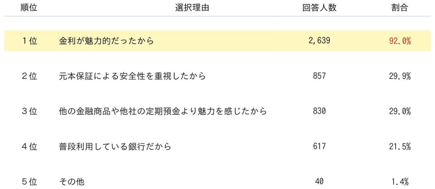 ・92%に当たる2,639人が「金利が魅力的だったから」を選択し1位に。次いで、「元本保証による安全性を重視したから」「他の金融商品や他社の定期預金より魅力を感じたから」が続きました。