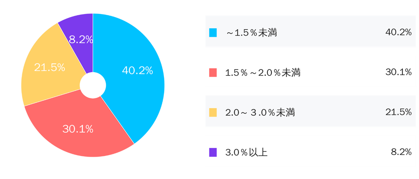 ・「~1.5%未満」が40.2%と最も多く、「1.5%~2.0%未満」が30.1%、次いで「2.0%~3.0%」が21.5%となりました。「3.0%以上」との回答の中には、10%以上とのお声もありました。