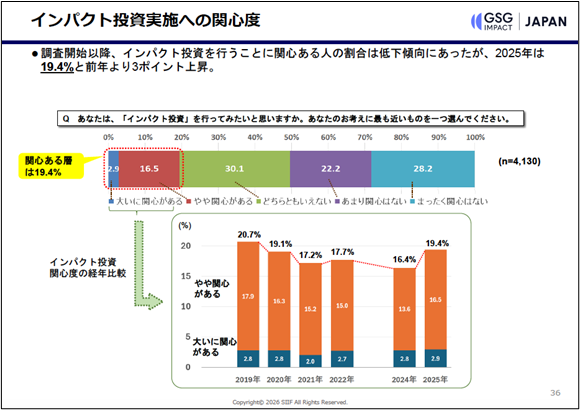 インパクト投資を実際に行うことに「関心がある」と回答した層は19.4%となり、前年から3ポイント上昇しました。