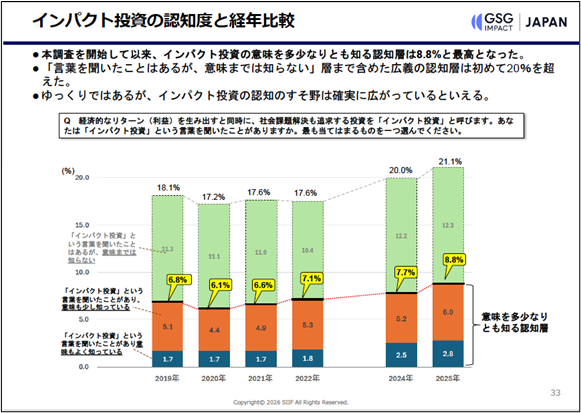 インパクト投資の意味を「多少なりとも知る」層は8.8%となり、調査開始以来の最高値を記録しました。
