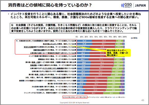 インパクト投資に関心を持つ層が投資対象として関心を示した領域は、再生可能エネルギー、環境、医療、介護などが上位となりました。