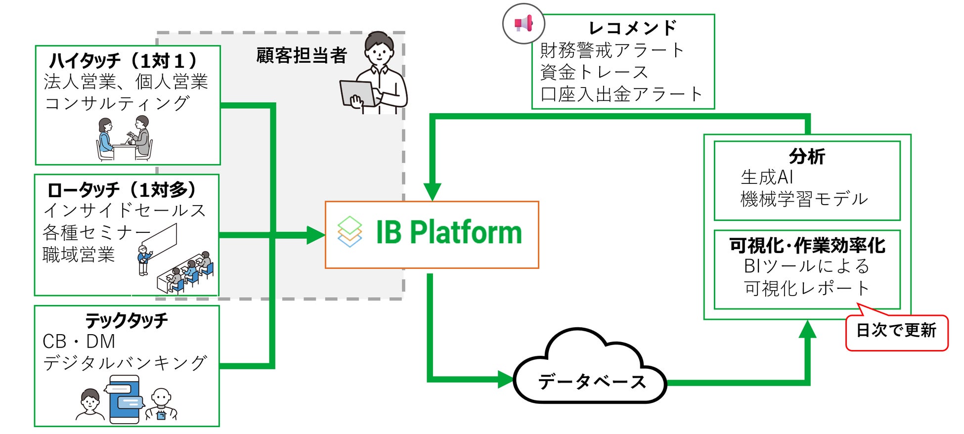 IBPlatformは、多様な顧客接点(ハイタッチ/ロータッチ/テックタッチ)から得られる情報をデータベースに蓄積しています。