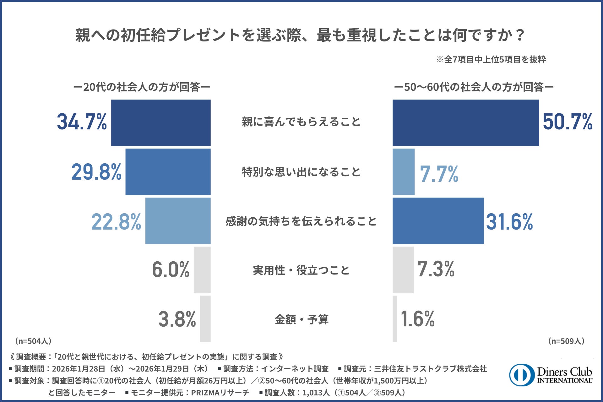 ダイナースクラブカードを発行する三井住友トラストクラブ株式会社(代表取締役社長:五十嵐幸司、以下当社)は、20代とその親世代を対象(調査概要参照)に「初任給プレゼントの実態」に関する調査を実施しました。