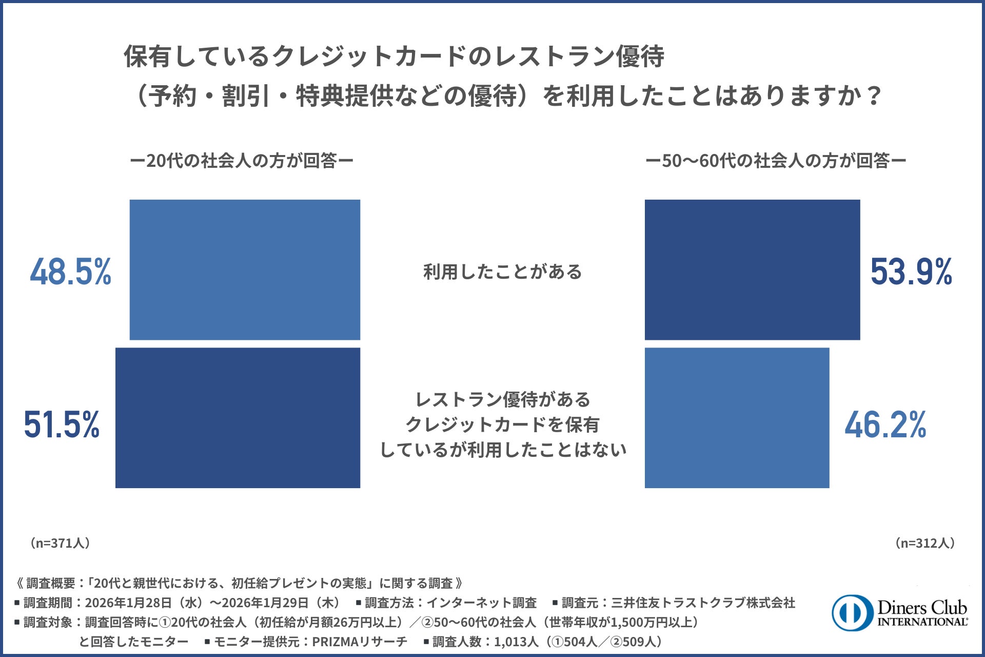 クレジットカードのレストラン優待の利用は、親世代では「利用したことがある」と回答した方が5割強となった一方で、20代では「保有しているが利用したことはない」と回答した方が5割強となりました。店選びや予約に悩む20代が多い中で、その解決策となり得る「優待」が手元にありながら活用されていない状態であることが明らかになりました。